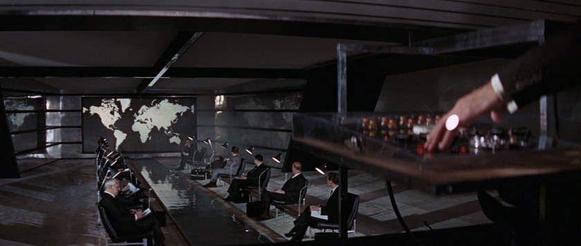 Last but not least is the production design by Ken Adam. Adam worked on a bunch of Bond movies, and his design work for Dr. No got him the gig with Stanley Kubrick for Dr. Strangelove and the war room set there. He’d later win an Oscar for Kubrick’s period film Barry Lyndon. It takes hardly any time at all for you to see Adam’s work in full display when we see all the top guy sat SPECTRE meeting in this wonderful wide open conference room full of trap doors to send people caught embezzling from the organization down a flaming pit. Even the good guys have a huge conference room to meet about Operation: Thunderball. What I love so much about how Adam designs the look of Bond films is the modern deco of spaciousness. Hotel rooms, conference rooms, even Largo’s yacht, the Disco Volante, feels like it has a bunch of head room and space. I feel like that is very much of the time. You see a lot of older Hollywood homes built in the 50s and 60s with that same idea of horizontal space across a single floor. It gives off an impression of being luxurious even if it is unrealistic or perhaps a facade. It is something your eyes may not always see, but your mind is given this nudge to think.