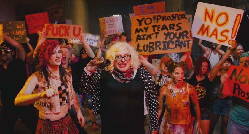 There are some great performances in this too. Kaufman himself plays two roles – Prospero, the man who sets the shitstorm into motion for revenge, and his sister, Antoinette, a woman who is treacherous and tries betraying everyone and everything. He’s fantastic in this. When he makes good on his revenge, he’s killing it with a great, scary, and extremely well-shot soliloquy. Even his role as Antoinette is well played in drag. I love every moment of Abraham Sparrow’s performance as Big Al, the primary target of Prospero’s wrath. He often shouts things like, “I need more hookers and drugs!” We also have the social media SJW characters of Trini and Steph played by Dylan Greenberg and Zoe Geltman. They are kind of a chorus together. They are fun in their ridiculousness and over-the-top caricature of the “woke”, socially-minded media influencers – who also happen to be working for a Big Pharma bullshit company.