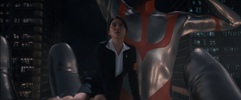 Even when, suddenly, unexpectedly, and out of nowhere, a beam of light flies down from the sky, and a giant savior arrives, it still feels real in this world of the movie. Still, the SSSP studies the monsters’ attack on this strange, silver being from the stars (our titular Ultraman) and its counterattack. This opening sequence gives us a combination of that wonder we get from this genre, the thrill of something inconceivably powerful, and what the bystanders must do to understand what they saw. That’s immediately followed by us overhearing what people on the streets are saying to each other about what happened. This is not universally accepted as a good thing.
