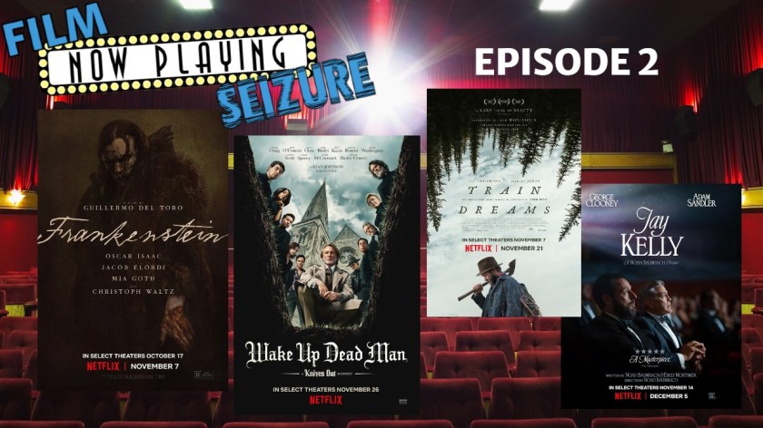On the second episode of Film Seizure: Now Playing, the guys discuss a foursome of movies streaming currently on Netflix – Guillermo del Toro’s Frankenstein, the latest Knives Out mystery, Wake Up Dead Man, Train Dreams, and George Clooney’s Jay Kelly.